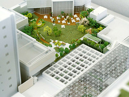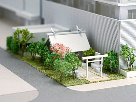 | 集い憩える屋上庭園。 | 国道11号線に面した一角に亀戸水神社が建立されます。 |